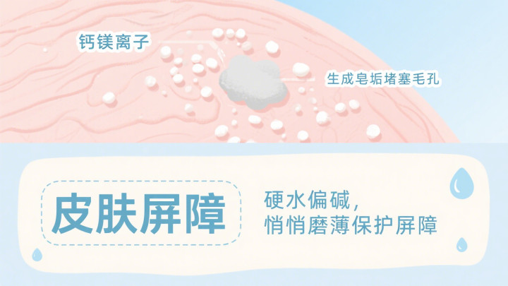 咱们常说的硬水,里面的钙镁离子就像偷偷粘在脸上的 “小顽固”。每次用洗面奶时,它们会跟皂基成分缠在一起,生成洗不掉的皂垢。这些东西附在皮肤上,不仅让洗面奶的清洁力打了折扣,还像 tiny 的 “毛孔小塞子”,时间久了可能闷出闭口;更糟的是,硬水偏碱性,会把皮肤表面那层保护水分的弱酸屏障 “磨薄”,难怪北方朋友一到春天,脸就容易又干又痒。