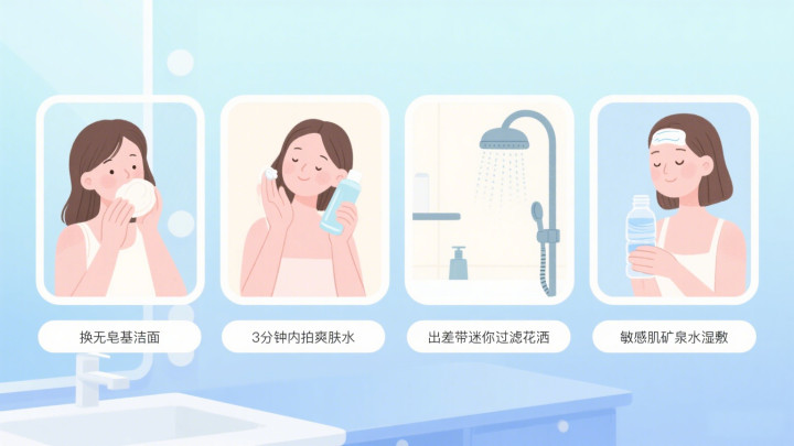 其实对付硬水不用大费周章,几个小技巧就能改善:先把洗面奶换成无皂基的低泡款,从源头减少皂垢;洗完脸 3 分钟内,赶紧用含果酸的爽肤水轻拍,中和掉水里的碱性残留;出差时塞个迷你过滤花洒在行李箱,试过的人说这样能减少六成矿物质残留;敏感肌的朋友,每周用矿泉水浸化妆棉擦一擦脸,就像给皮肤做了次 “纯净水 SPA”,舒服又养肤。